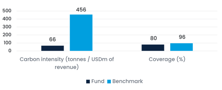 - Our fund’s GHG intensity is 86% below the benchmarks; primarily because we do not invest in fossil fuel companies and because we do consider carbon intensity versus peers as part of the investment process. We would typically not invest in companies with a carbon intensity considerably above peers.